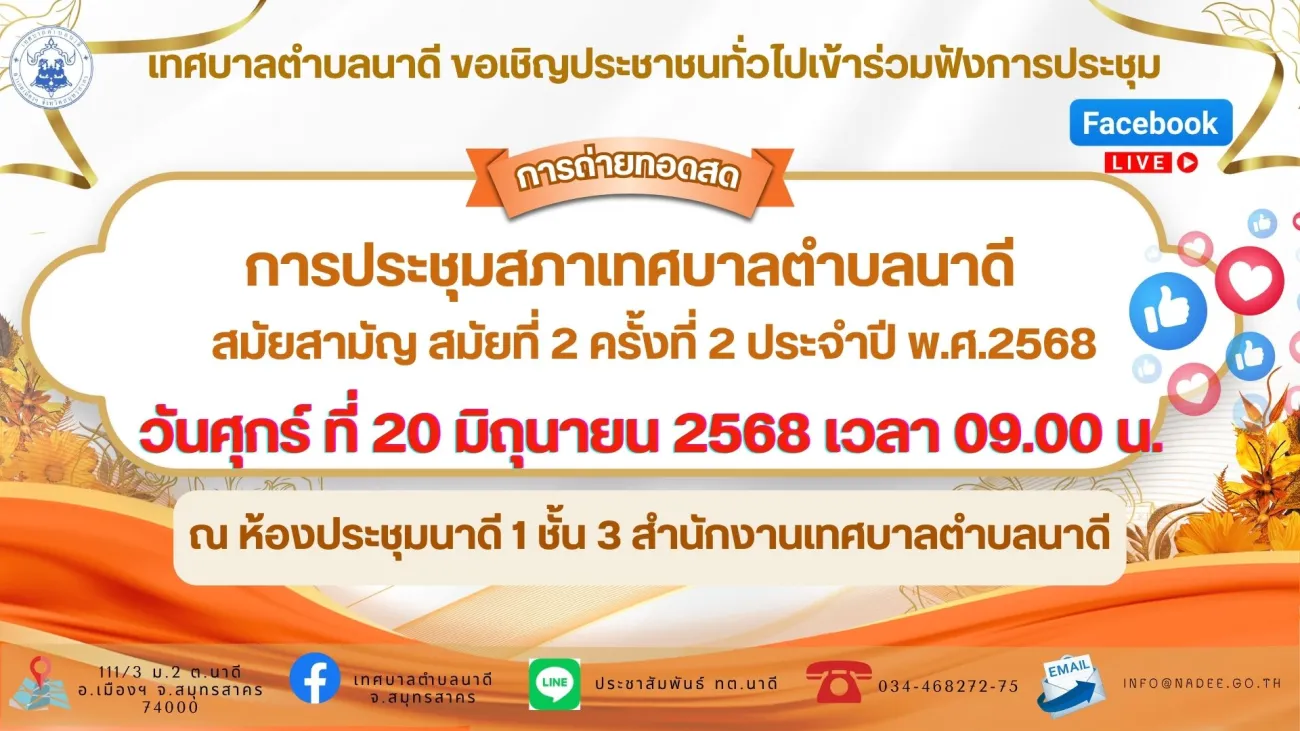 เทศบาลตำบลนาดี ขอเชิญประชาชนทั่วไปเข้าร่วมฟังการประชุมสภาฯ (ไลฟ์สด ผ่าน facebook live) ประชุมสภาเทศบาลตำบลนาดี สมัยสามัญ สมัยที่ 2 ครั้งที่ 2 ประจำปี พ.ศ.2568 วันศุกร์ ที่ 20 มิถุนายน 2568 เวลา 09.00 น. ณ ห้องประชุมนาดี 1 ชั้น 3 สำนักงานเทศบาลตำบลนาดี