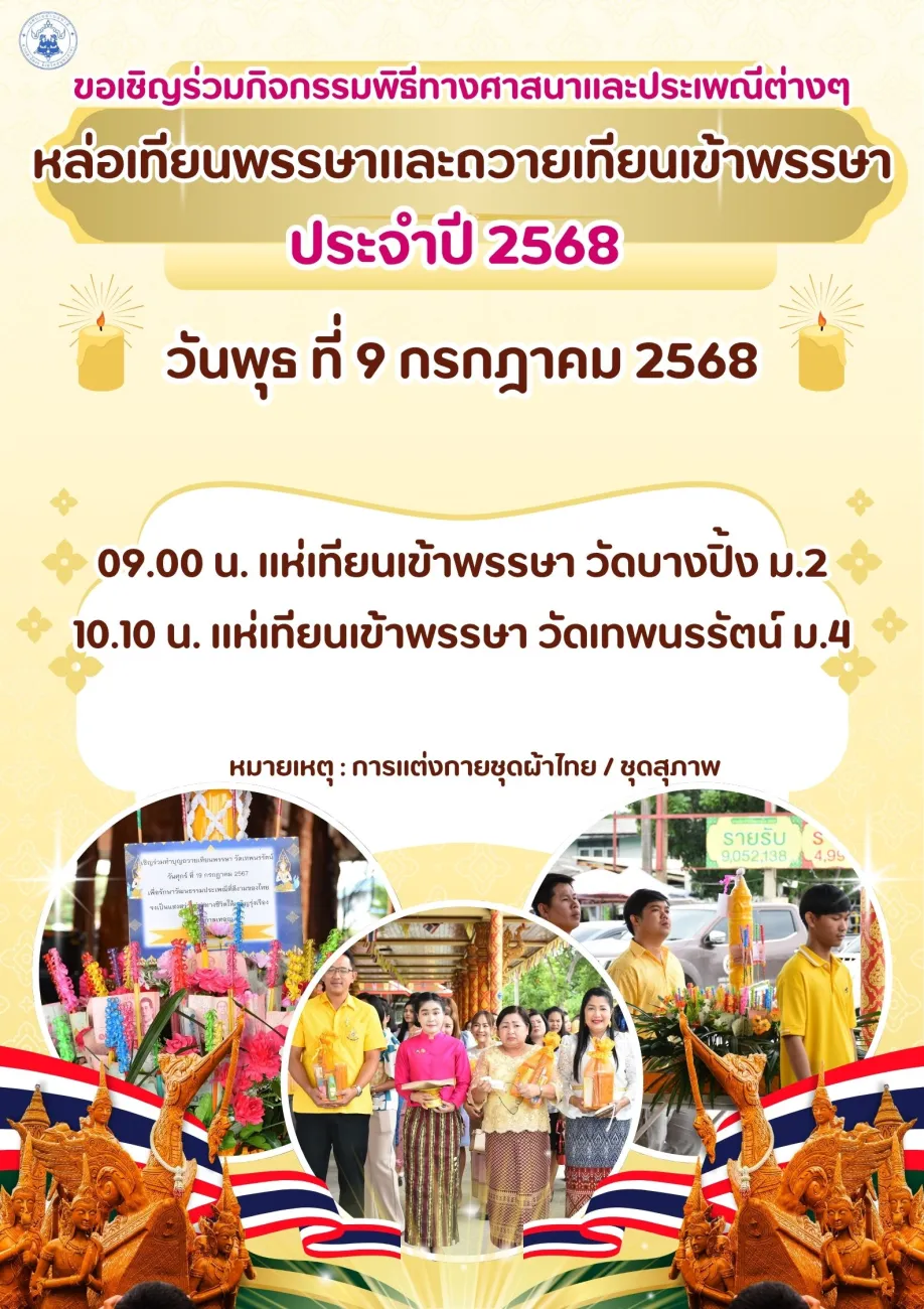 ขอเชิญร่วมกิจกรรมพิธีทางศาสนาและประเพณีต่างๆ หล่อเทียนพรรษาและถวายเทียนเข้าพรรษา ประจำปี 2568 วันพุธ ที่ 9 กรกฎาคม 2568