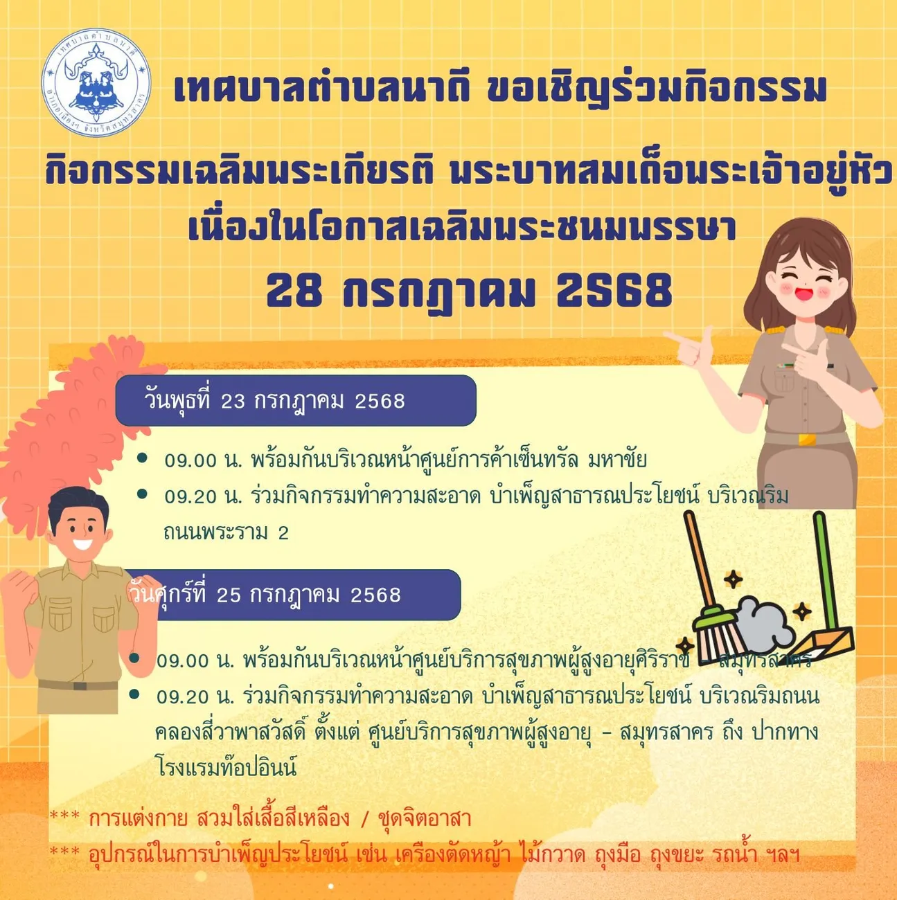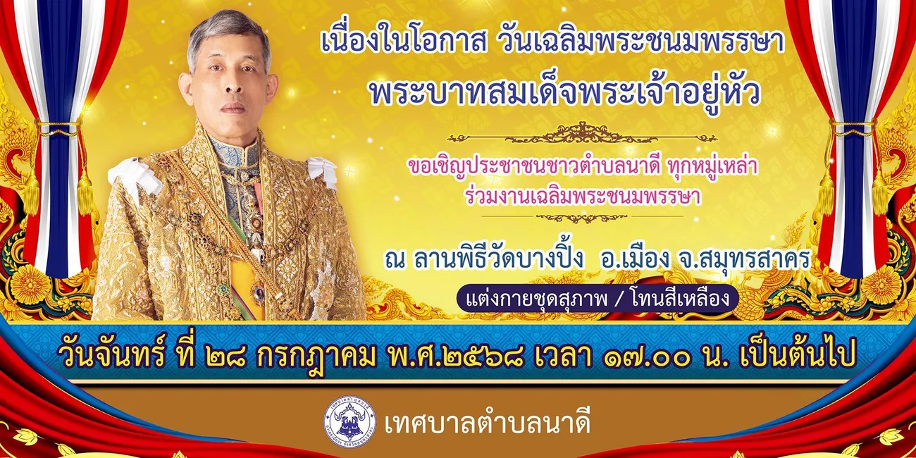 เทศบาลตำบลนาดี ขอเชิญประชาชนชาวตำบลนาดี ทุกหมู่เหล่า ร่วมงานเฉลิมพระชนมพรรษา เนื่องในโอกาสวันเฉลิมพระชนมพรรษาพระบาทสมเด็จพระเจ้าอยู่หัว ณ ลานพิธีวัดบางปิ้ง อำเภอเมือง จังหวัดสมุทรสาคร ในวันจันทร์ที่ 28 กรกฎาคม 2568 เวลา 17:00 น. เป็นต้นไป