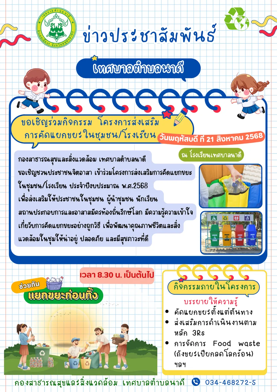 ข่าวประชาสัมพันธ์ เทศบาลตำบลนาดี ขอเชิญร่วมกิจกรรม โครงการส่งเสริมการคัดแยกขยะในชุมชน /โรงเรียน ประจำปีงบประมาณ พ.ศ.2568 วันพฤหัสบดีที่ 21 สิงหาคม 2568 ณ โรงเรียนเทศบาลนาดี