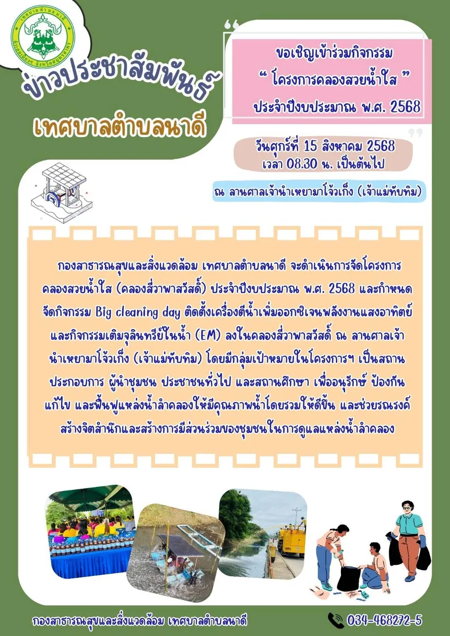 ข่าวประชาสัมพันธ์ เทศบาลตำบลนาดี ขอเชิญร่วมกิจกรรม โครงการคลองสวยน้ำใส ประจำปีงบประมาณ พ.ศ.2568
