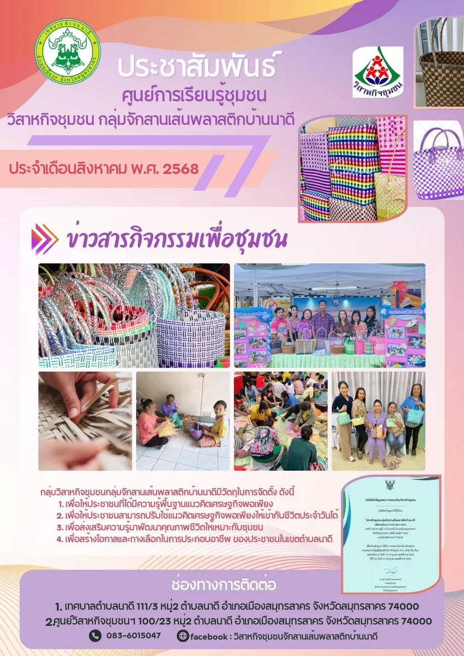 ประชาสัมพันธ์ ศูนย์การเรียนรู้ชุมชน วิสาหกิจชุมชน กลุ่มจักสานเส้นพลาสติกบ้านนาดี ประจำเดือนสิงหาคม พ.ศ. 2568