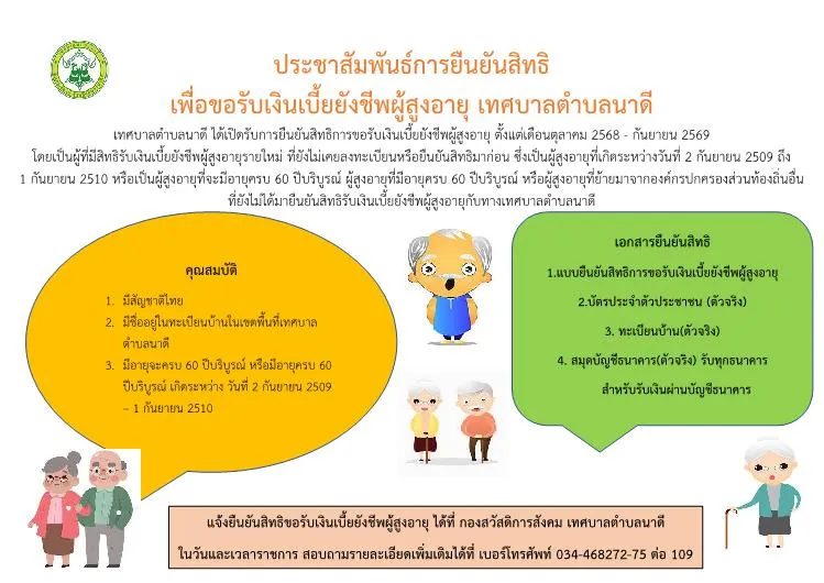 ประชาสัมพันธ์การยืนยันสิทธิ การขอรับเบี้ยยังชีพผู้สูงอายุเทศบาลตำบลนาดี (รายใหม่) ตั้งแต่เดือนตุลาคม 2568 - กันยายน 2569