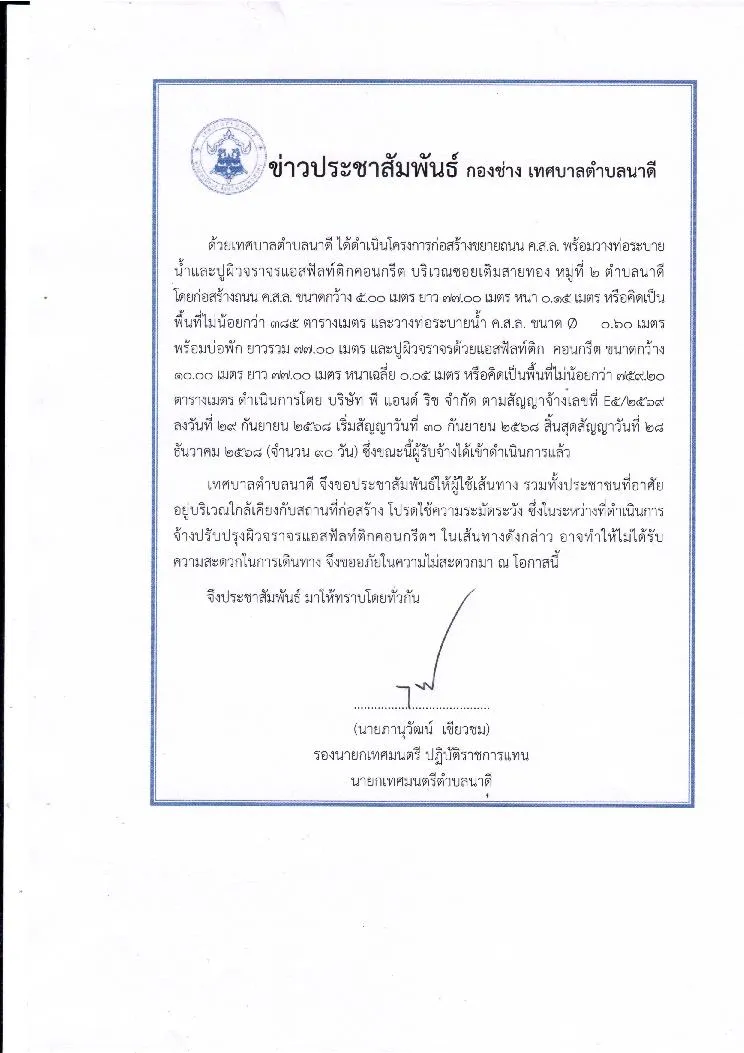 ข่าวประชาสัมพันธ์ กองช่าง เทศบาลตำบลนาดี ผู้รับจ้างจะเข้าดำเนินโครงการก่อสร้างขยายถนน ค.ส.ล. พร้อมวางท่อระบายน้ำและปูผิวจราจรแอสฟัลท์ติกคอนกรีต บริเวณซอยเติมสายทอง หมู่ที่ 2 ตำบลนาดี